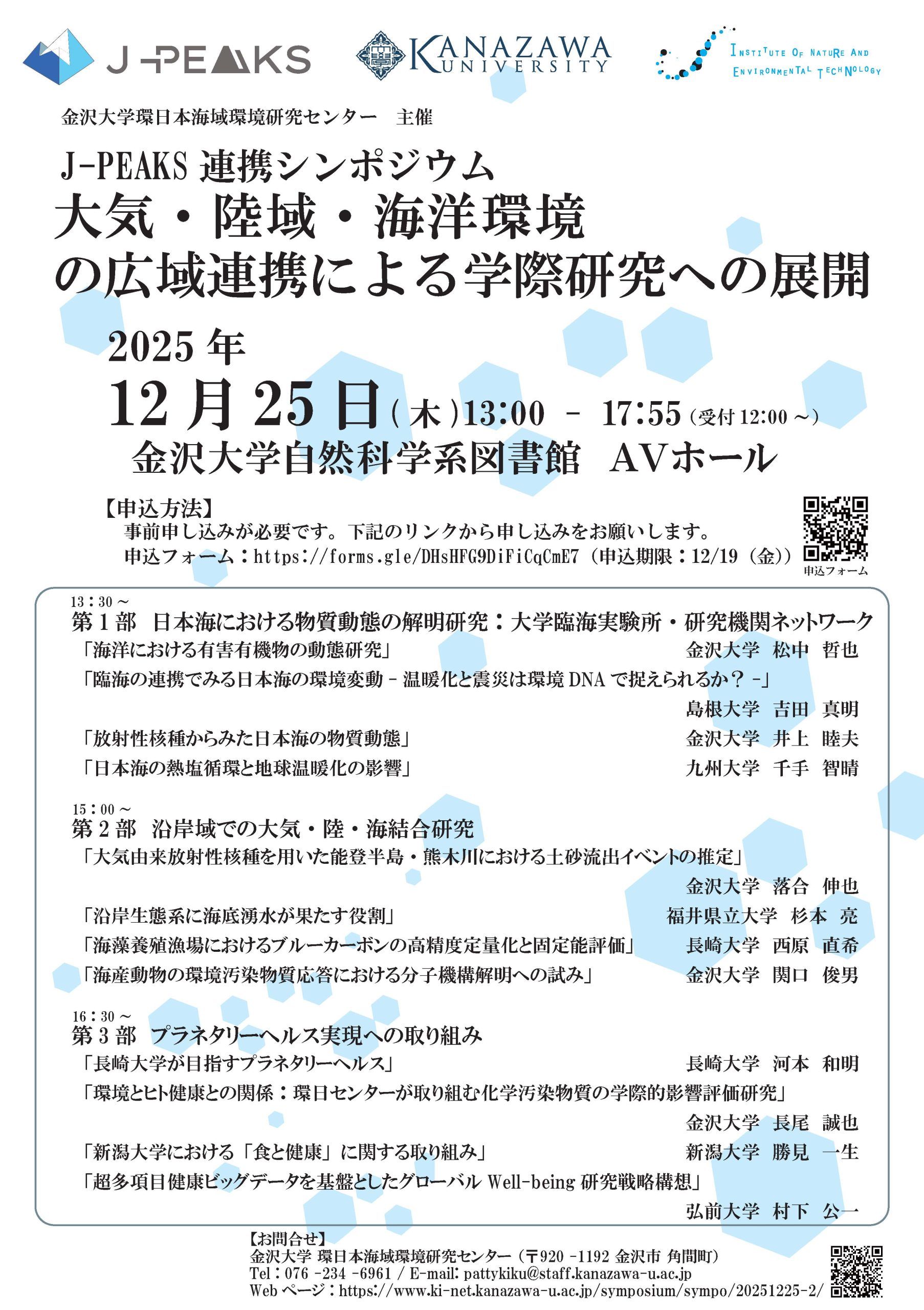 12月25日(木)、金沢大学環日本海域環境研究センター主催 J-PEAKS連携シンポジウム「大気・陸域・海洋環境の広域連携による学際研究への展開」にて、村下教授が特別講演を行います。
