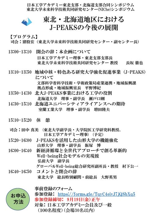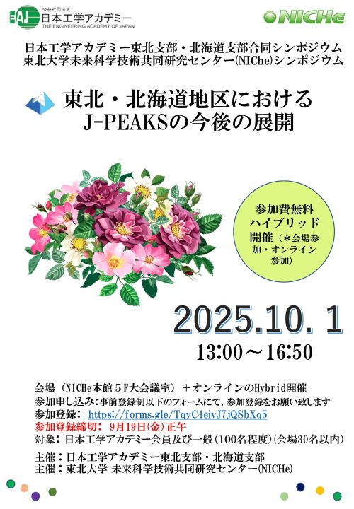 同シンポジウムは、日本工学アカデミー会員及び一般向けに開催され、当日は東北・北海道地区におけるJ-PEAKSの今後の展開について熱い議論が交わされました。ご聴講いただいた皆様、ありがとうございました。