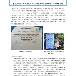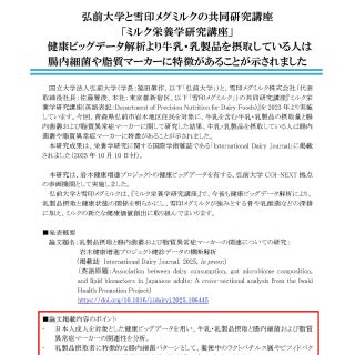 R7活動報告 2025年11月05日NEW R7活動報告お知らせ活動報告記事掲載(R7) 【プレスリリース】雪印メグミルクと弘前大学の共同研究講座「ミルク栄養学研究講座」 健康ビッグデータ解析により牛乳・乳製品を摂取している人は腸内細菌や脂質マーカーに特徴があることが示されました