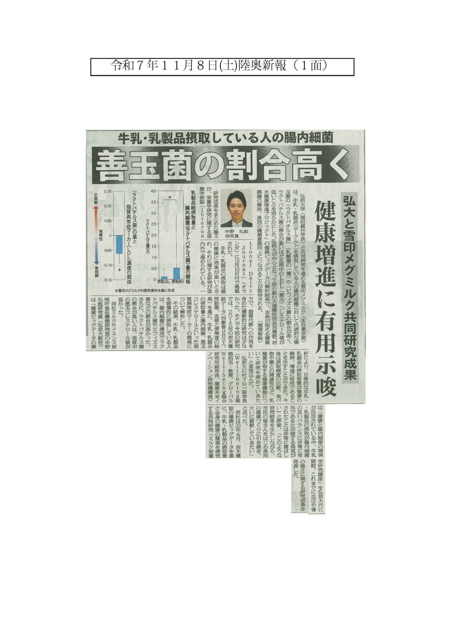 【メディア情報】弘前大学と雪印メグミルクの共同研究の成果について、陸奥新報(11月8日)に掲載されました。 2025年11月12日 弘前大学と雪印メグミルクの共同研究の成果について、陸奥新報(11月8日(土))に掲載されました。 記事では、岩木健診のデータ解析による研究成果と村下教授のコメントが掲載されています。 ー稲葉智絵記者(陸奥新報社) ※画像をクリックすると拡大表示されます。 (陸奥新報社) ※これらの記事に関しましては、陸奥新報社より掲載許可を得ています。 ※この画像は、当該ページに限って陸奥新報社の記事利用を許諾したものです。 転載ならびにこのページへのリンクは固くお断りします。