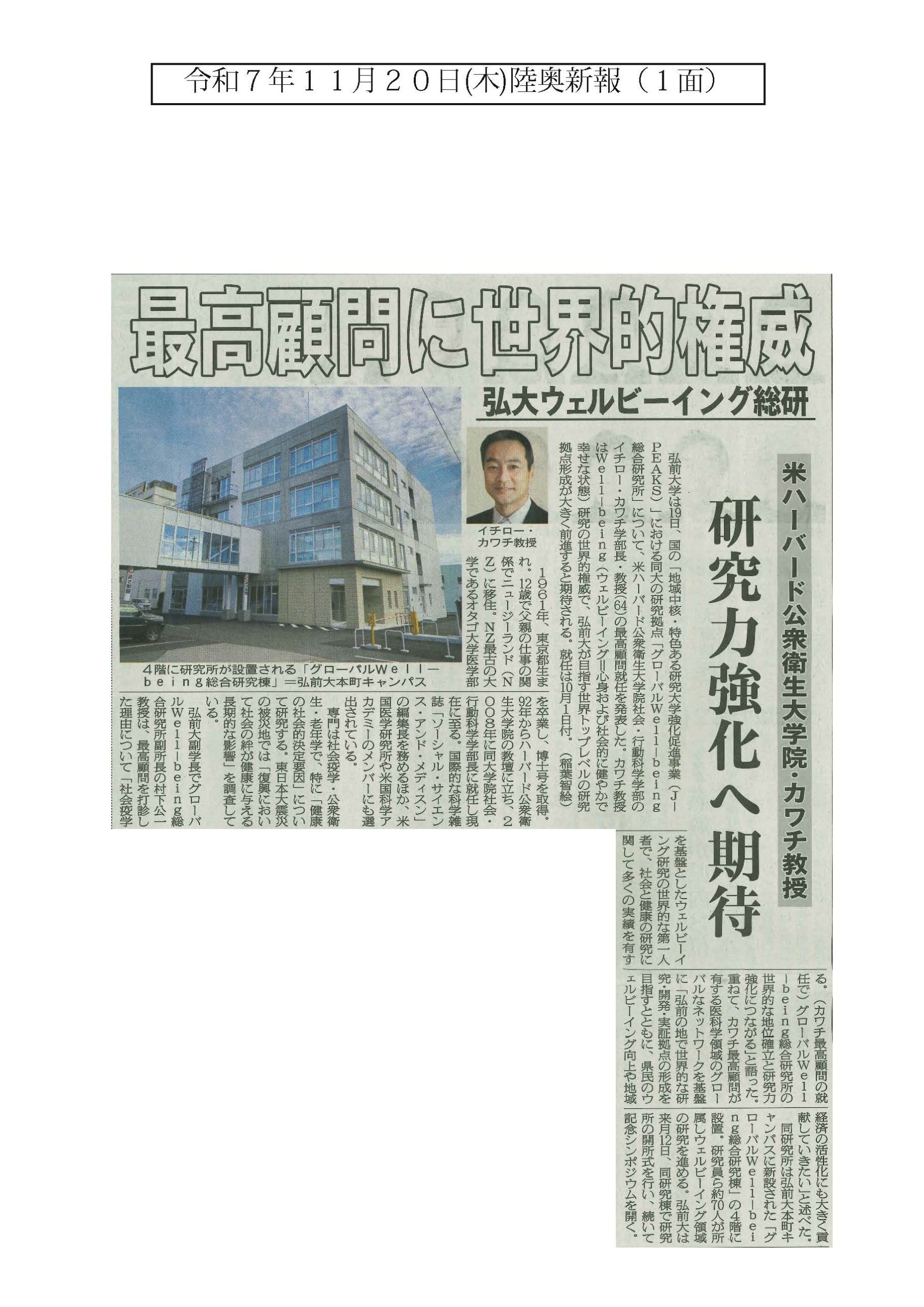 米ハーバード公衆衛生大学院社会・行動科学学部のイチロー・カワチ学部長・教授の就任を発表したことについて、陸奥新報(11月20日(木))に掲載されました