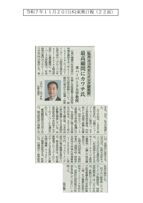 11月19日(水)弘前大学が「グローバルWell-being総合研究所」の最高顧問に米ハーバード大学教授で社会疫学が専門のイチロー・カワチ氏の就任を発表したことについて、東奥日報(11月20日(木))に掲載されました
