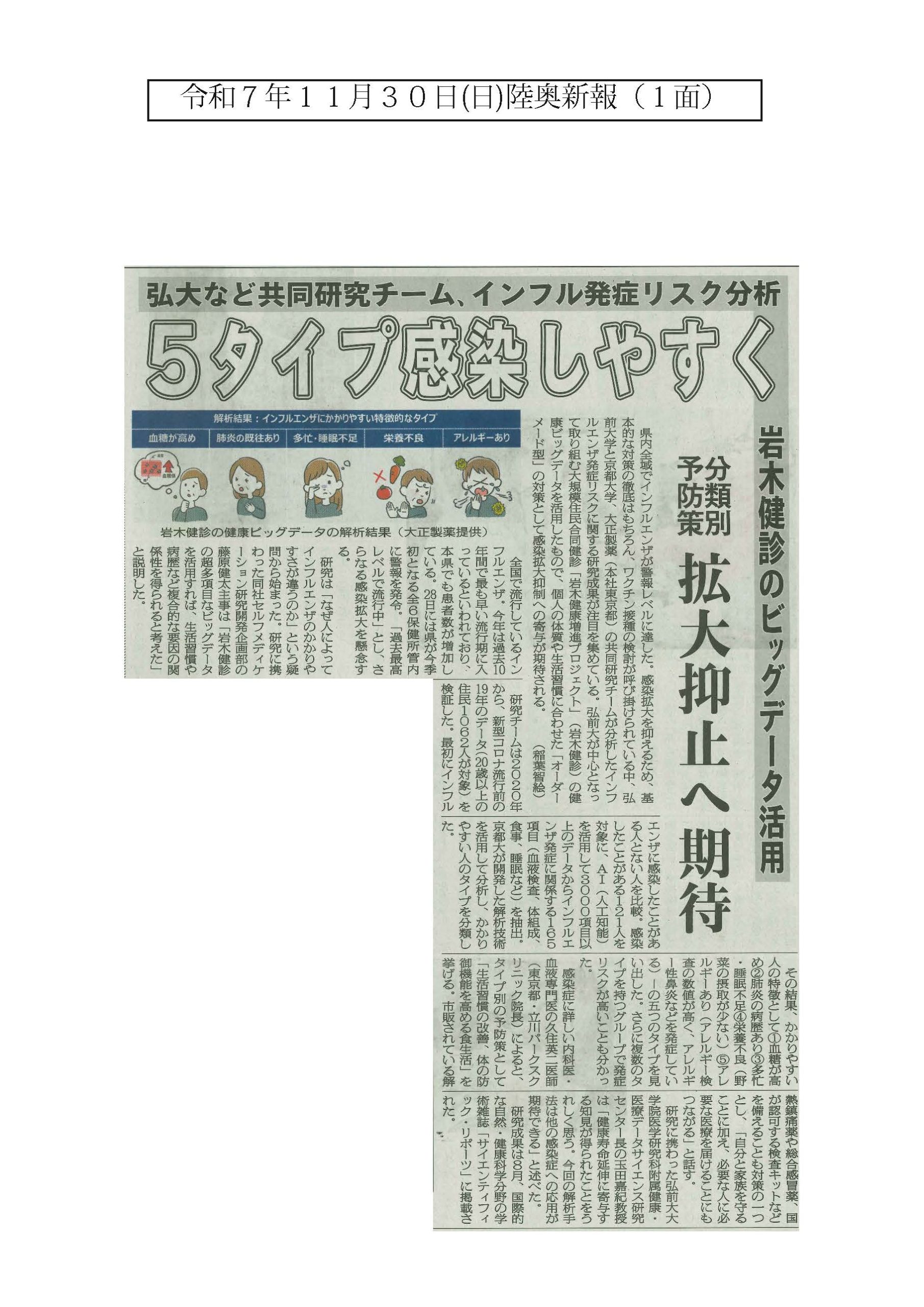 弘前大学、京都大学と大正製薬㈱(本社:東京)の共同研究チームが分析したインフルエンザ発症リスクに関する研究成果について、陸奥新報(11月30日)に掲載されました。