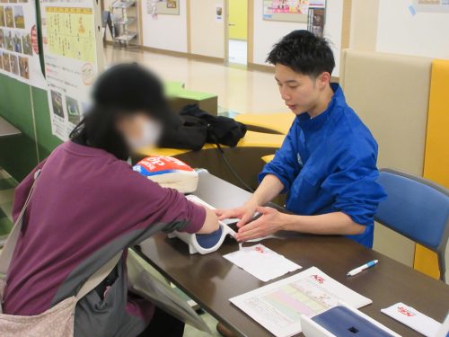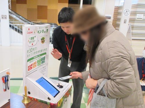 当日は、食育に関するパネル展示や体験コーナーが設けられ、多くの来場者でにぎわいました。弘前大学COI-NEXTは、食生活改善推進員会と連携した減塩レシピの紹介や、ハウス食品グループ本社㈱の嗜好濃度(塩味)テスト、雪印メグミルク㈱のAGEs測定とカルシウム診断を行い、ブースには約150名以上の方に足をお運びいただきました。そのほか、カゴメ㈱の方からは、ベジチェックを使用したゲームの実施や、弘前市・食生活改善推進員会と共同で簡単でおいしいお弁当の野菜メニュー調理実演・試食を行い、大盛況のフェスティバルとなりました。