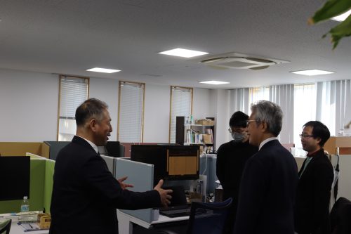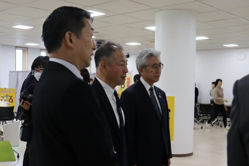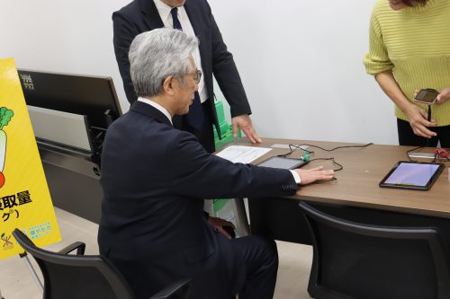 櫻田市長は、弘前大学副学長(Well-being戦略担当)・教授/グローバルWell-being総合研究所 副所長/健康未来イノベーション研究機構長 村下公一先生の案内のもと、QOL健診の様子と弘前大学グローバルWell-being総合研究棟を視察されました。櫻田市長も野菜摂取レベル測定を体験され、シバタ医理科の皆様へ日頃の野菜摂取についてお話しされていました。