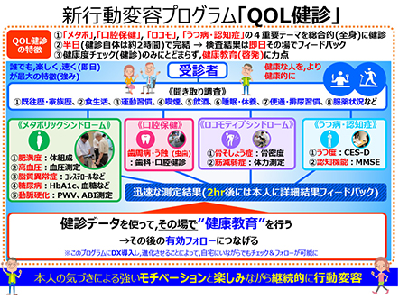 医療費などの社会保障費の問題が深刻化する現在、予防医療・先制医療など疾病になる前に予防や対策を行う医療への期待が高まっています。このため本拠点では、従来型の健診をさらに補完し、健康意識(ヘルスリテラシー)の向上を目的に、これまでのノウハウや知見を凝縮した新行動変容プログラムとして「QOL健診」を開発しました。この健診の特長は、検査項目を「メタボリックシンドローム」「ロコモティブシンドローム」「口腔保健」「うつ病・認知症」の4つの重要領域に絞り込み、健診の即日約2~3時間のうちに健診の実施・結果通知、その後の行動変容に向けた健康教育までを一気通貫で完結させるコンパクト型のプログラムパッケージです。