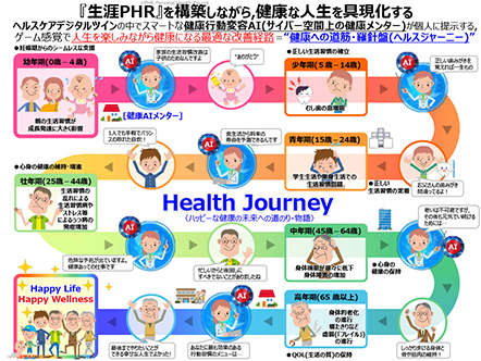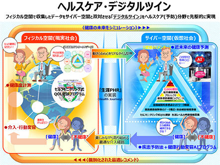 ヘルスケア・デジタルツインとは、個々人が日常の生活を自然に送っているだけで、フィジカル空間(現実社会)のあらゆる動きがサイバー空間(仮想社会)にリアルタイムで反映され、サイバー空間からフィジカル空間ヘフィードバックを受けられる仕組みのことを指します。多様なデータが統合されたサイバー空間上で開発した健康行動変容AI(人工知能)が、日常生活および人生の中で健康になる介入・改善経路を示し、健康な未来への道のりを歩む物語、すなわち「ヘルスジャーニー(健康物語)」を描き出します。そして、サイバー空間から、シミュレーションや最適な生活習慣への介入方法などのフィードバックを受けて、人々がフィジカル空間でヘルス ジャーニーを実現していくサイクルを作りだします。すごろくのようなゲーム感覚で、楽しみながら健康的な生活を実践し、ワクワクしながら人生を楽しむことで、サイバー空間とフィジカル空間のヘルスジャーニーを一致させることを目指しています。