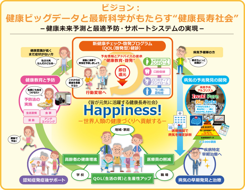 弘前大学は平成25年に、COI全国12拠点の一つに採択され、拠点名を真の社会イノベーションを実現する革新的「健やか力」創造拠点と銘打ち、岩木健康ビッグデータを活用した認知症や生活習慣病など病気の予兆発見の開発や、予防法を開発する研究とビジネス化に取り組んでいます。これらを社会実装することで、高齢者の健康寿命延伸が可能となり、高齢者の認知症や生活習慣病を減らすことで医療費の削減もめざします。最終的にはQOL向上を実現して、健康ビッグデータと最新科学がもたらす“健康長寿社会”(下図参照)を達成します。