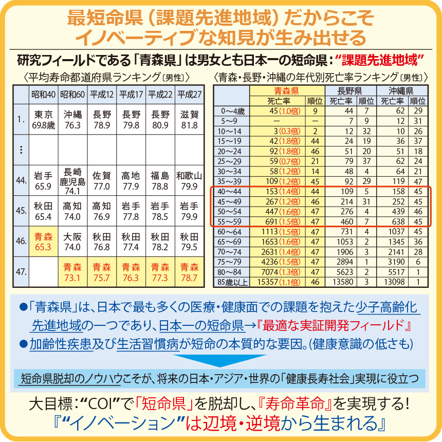 なかでも青森県は、高齢化に加え、40歳以上の加齢性疾患・生活習慣病の罹患率・死亡率が高く、県民の寿命を大きく損なっています。厚生労働省が5年ごとに行っている都道府県別平均寿命ランキングでも、青森県の平均寿命が全国最下位ということがわかっています。性別でみると、青森県の男性は1985年から、女性も2000年から平均寿命最下位の状態が続いているのです。