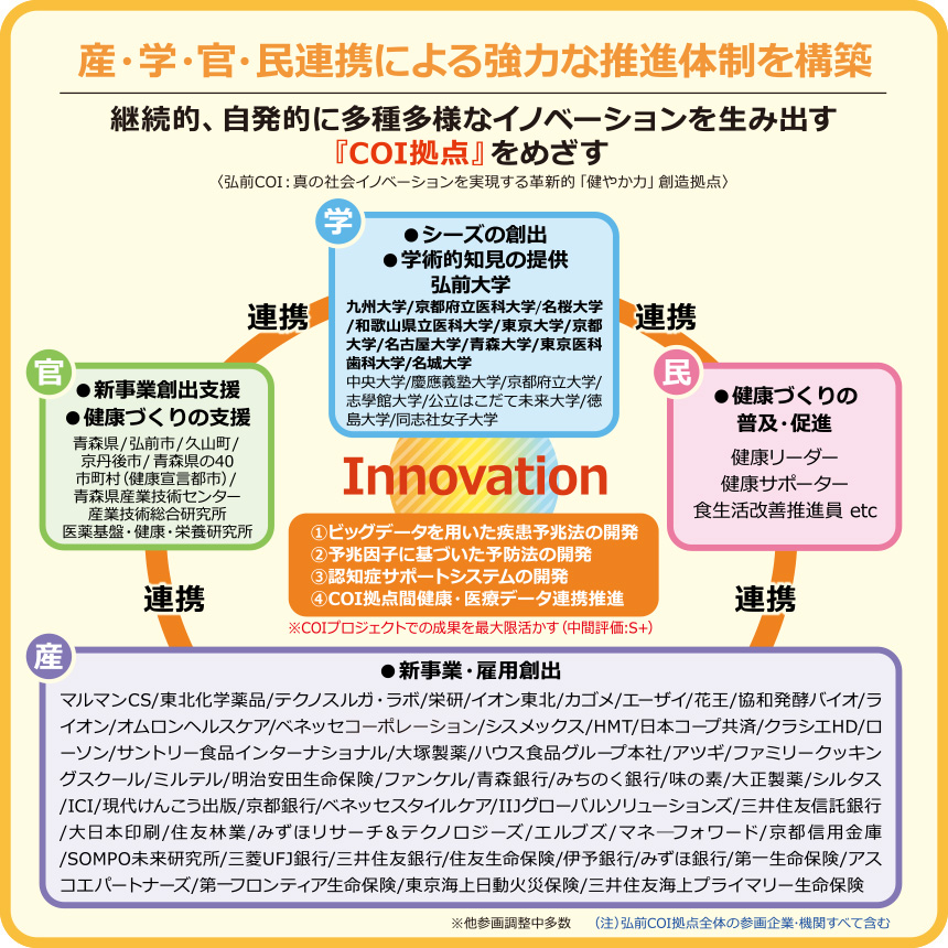 拠点には、花王、ライオン、イオンリテール、エーザイ、ベネッセコーポレーション、協和発酵バイオ、カゴメ、ハウス食品グループ本社、クラシエHD、ローソン、サントリー食品インターナショナル、ファンケルなど有力企業が40社以上参画し、本学が立地する青森県・弘前市とも一体となって、強固な産学官民連携体制を構築しています。