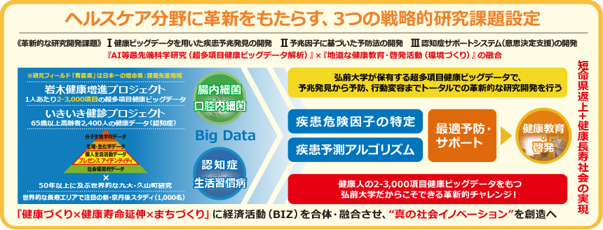 また、認知症発症後の意思決定サポートシステム開発や「京丹後コホート」を実施する京都府立医科大学および、世界的に知られる「久山町研究」を率いる九州大学医学部がサテライト拠点として加わったほか、名桜大学、和歌山県立医科大学とも連携し、研究フィールドを拡大しています。平成27年度より本学は九州大学が主導する「健康長寿社会の実現を目指した大規模認知症コホート研究」に加わり、弘前市と連携して高齢者健康調査「いきいき健診」を実施しており、ビッグデータを拡充させています。