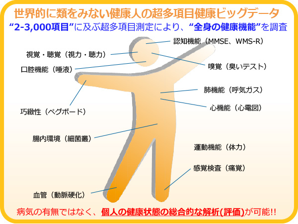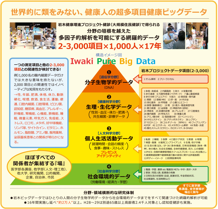 岩木健康増進プロジェクト健診で得られる住民の健康情報は、体格や体組成、血液や尿検査といった基礎的な生理・生化学データに限らず、手間や費用のかかる体力測定(運動機能)、ゲノム解析、好中球活性酸素種生能測定、リンパ球機能分析、腸内・口腔内細菌、脂肪酸・アミノ酸分析、血液・メタボローム解析、血清中の微量元素測定、吸気中成分分析などのデータから、就寝時間(睡眠)や食事内容といった個人の生活状況に関するデータ、労働環境、家族構成、学歴といった社会的環境に関するデータまで、全てを合わせると項目数は約2,000以上にも及びます。