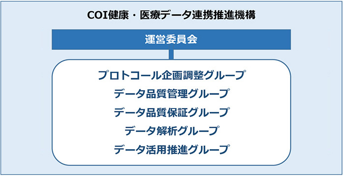 - COIデータ連携機構の業務に係る企画立案及び総合調整に関する事項を審議する運営委員会と各種業務を担うグループを組織しています。