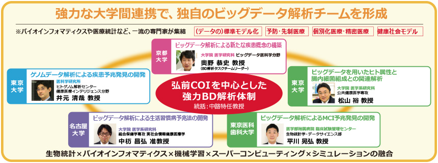 さらに京都大学(医)や東京大学(医)、東京大学医科学研究所、名古屋大学(医)、東京医科歯科大学からバイオインフォマティクスや生物統計など、一流の専門家を迎えてビッグデータ解析体制を強化して最先端の研究を推進し、AI(人工知能)を適用してビッグデータから新たな価値創出をめざします。
