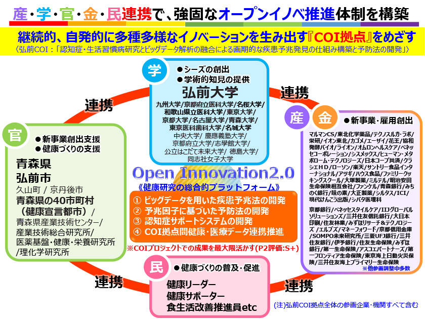 本拠点では産学官が⼀体となり,弘前⼤学が有しているビッグデータを活⽤し,早期発⾒の仕組みを構築し,予兆に基づいた予防法を開発します。10年後,誰もが健康で⽣き⽣きと暮らせる⻑寿健康社会を⽬指します。