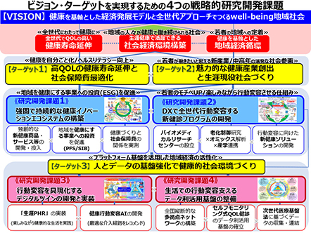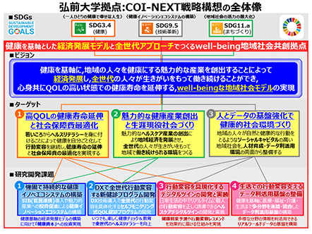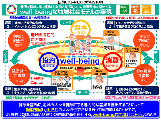 弘前大学では、文部科学省・国立研究開発法人科学技術振興機構(JST)が実施する大型研究支援プログラム「共創の場形成支援プログラム(COI-NEXT)」の拠点として、拠点名を「健康を基軸とした経済発展モデルと全世代アプローチでつくるwell-being地域社会共創拠点」と名付け、健康を基軸に、地域の人々を健康にする魅力的な産業を創出することによって経済発展し、全世代の人々が生きがいをもって働き続けることができ、心身共にQOLの高い状態での健康寿命を延伸する、well-beingな地域社会モデルの実現を目指しています。「健康を基軸に、地域の人々を健康にする魅力的な産業を創出することによって経済発展し、全世代の人々が生きがいをもって働き続けることができ、心身共にQOLの高い状態での健康寿命を延伸する、well-beingな地域社会モデルの実現」というビジョン達成のため、3つのターゲットを定め、4つの研究課題に取り組んでいます。