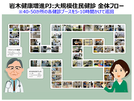 弘前大学では、この状況を打開するため2005年に弘前市岩木地区の住民に対して健康増進活動「岩木健康増進プロジェクト健診」(以下、岩木健診)を開始しました。健診は、地区の大きなホール(公民館)にて毎日約300人もの医師を含む医療系スタッフが連続10日間にわたり、1日当たり約100人、合計して約1,000人を対象に行うものです。健診のブース数は例年約50、早朝から開始し、所要時間は1人当たり平均して5~7時間程度を要する大規模なものです。